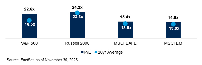 - Persistent concentration and high valuations raise the possibility of fragility in markets and warrant thoughtful portfolio construction as we look to 2026.