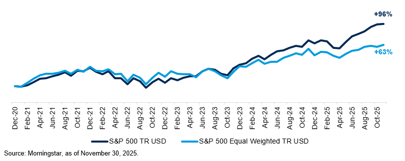 As the year winds down, markets remain supported by moderating inflation, stable monetary policy and a favorable corporate fundamental backdrop. However, elevated valuations, concentration driven by the strength in AI related securities, and persistent macro uncertainty call for thoughtful diversification and disciplined risk management. Our upcoming 2026 Investment Outlook will explore some of these themes in greater depth, and provide guidance for the positioning of portfolios in an evolving market environment.