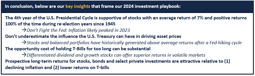 Following a historically challenging year for investors in 2022, equity markets delivered strong returns in 2023 as the widely expected recession was avoided. Just over a year ago (link) we highlighted our constructive view on the U.S. equity market for 2023. We emphasized that the S&P 500 had delivered positive returns in the 3rd year of the Presidential election cycle (the 12 months following a midterm election) in every instance since 1946, with an average annual return of +16%. The comparable period through November of 2023 was no exception, as the S&P was +22%, despite headwinds from an aggressive Federal Reserve interest rate hiking cycle, concerns around a debt shutdown, and heightened geopolitical risks.