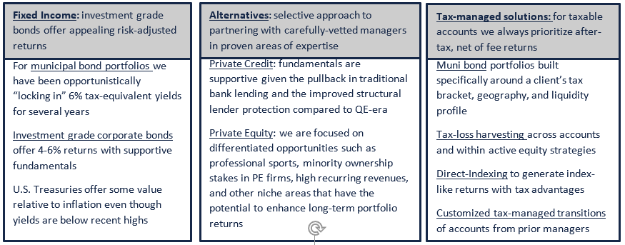 In addition to high-quality dividend and growth stocks, we continue to find attractive opportunities across fixed income, alternatives, and tax-managed equity for clients’ balanced portfolios.